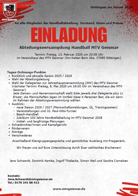 Abteilungsversammlung Handball 13.02.2026, 20 Uhr, Vereinshaus MTV Geismar