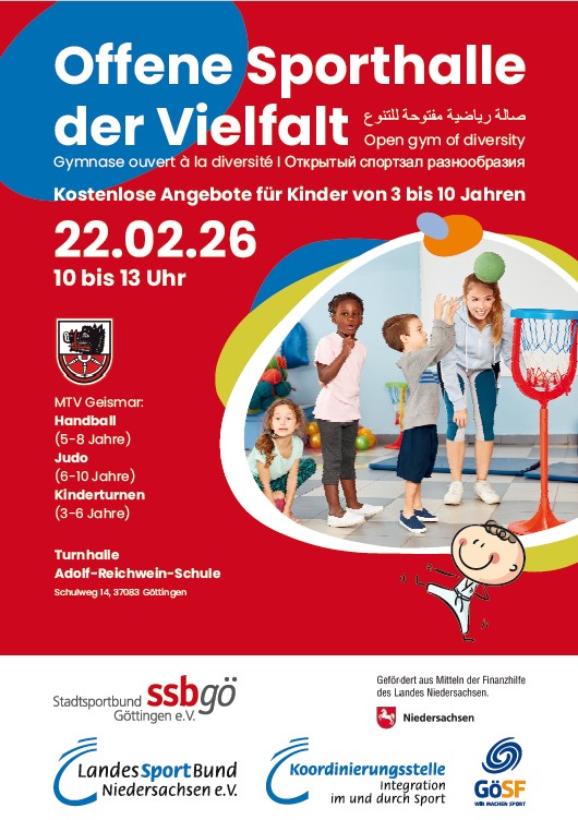 Auch in diesem Jahr beteiligt sich der MTV Geismar wieder an der Aktion „Offene Sporthalle der Vielfalt“, die vom SSB (Stadtsportbund) Göttingen organisiert wird. Am Sonntag, 22.02.2026, bieten wir in der Turnhalle der Adolf-Reichwein-Schule in Göttingen-Geismar, Schulweg, von 10 – 13 Uhr wieder ein buntes Sportprogramm an. Kinder im Alter von 3 – 10 Jahren können sich in den Sportarten Handball, Judo und Kinderturnen ausprobieren.